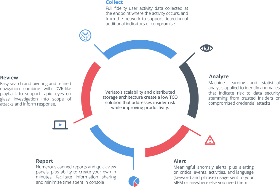 Veriato provides a unique, fully integrated solution that focuses on detection and response to insider threats through a combination of advanced behavioral analysis and context-rich logging of insider activity.